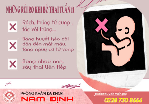 Bỏ thai 11 bằng những biện pháp hiện đại tuy độ an toàn cao nhưng cũng tiềm ẩn rủi ro nếu không được thực hiện tại cơ sở y tế đảm bảo, vì có thể dẫn đến biến chứng thủng tử cung, dính tử cung hoặc sót nhau sót thai gây hoại tử buồng tử cung, có nguy cơ vô sinh hiệu quả. Chính vì thế lựa chọn cơ sở y tế chuyên khoa rất là quan trọng. Hiện tại, Phòng Khám Đa Khoa Nam Định là một trong những địa chỉ phá thai được đánh giá cao và nhiều chị em tin tưởng lựa chọn khi muốn đình chỉ thai kỳ.